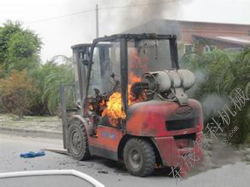 叉車上的可燃物(柴油、潤滑油、橡膠制品等)在空氣中遇到火源(如電焊、氣割、吸煙、電線老化搭鐵及線路接觸不良產生的電火花等)而引起燃燒。