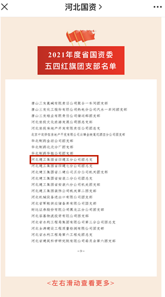 5月上旬,喜訊傳來!五分公司團總支受到河北省國資委團委、省國資委青聯聯合表彰,被評為“2021年度河北省國資委五四紅旗團支部”。