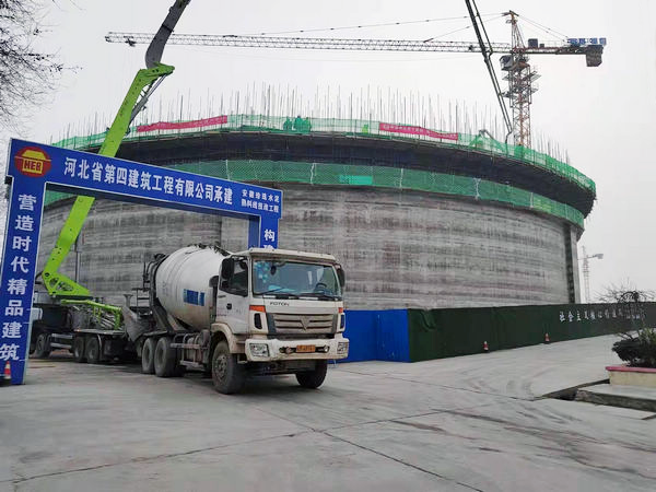 熟料儲存及輸送筒倉直徑60米,高20.5米。1月11日,業主項目負責人王利杰組織召開專題會議,鄭重要求1月20日前滑模施工必須完成。面對業主早日投產的殷切期盼,項目部緊急組織施工策劃,明確搶進度措施辦法,全體動員,多點發力,全力以赴保滑模施工。在動員會上,成立了以項目經理為組長的滑模領導小組,班子帶班,明確責任目標;與作業班組簽訂安全、質量承諾書,增強其責任意識;購置鋼筋間距測量設備,節省驗收鋼筋工程時間和人力。由于疫情原因,現場勞力不能迅速到位,項目部提前組織管理人員晚上加班吊運鋼筋、水泥、腳手板等材料,大家高漲的干勁兒在滑模現場起到了積極的帶動作用。庫壁預應力鋼絞線設置較為密集,每間隔26厘米一道,而且帶有柔性,往庫壁鋼筋內穿設時容易跑偏,工作效率低。為加快施工,技術人員巧妙地在庫壁鋼筋上加設了U型鋼筋固定鋼絞線穿行位置,然后大家一字排開,“一二、一二……”齊聲喊著口號,有節奏地用力將鋼絞線在庫壁鋼筋里穿行直到扶壁柱。數九隆冬的夜間滑模平臺上氣溫很低,但是大家的工作熱情不減,干勁不退,抬鋼筋、綁鋼筋、穿鋼絞線……,干得熱火朝天,沒有人叫苦喊累,在大家的共同努力下,滑模以每天2.7米的速度快速推進。