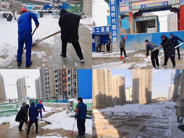 由于本輪低溫降雪持續(xù)時間較長,整個施工現(xiàn)場積雪不僅厚還很瓷實,清掃工作十分困難。寒風凜冽刺骨,但大家熱情高漲,充分發(fā)揚不怕苦、不怕累的精神,黨員干部帶頭,職工群眾踴躍參加,按照分工好的清掃區(qū)域全面鋪開進行。設(shè)備管理員系上安全帶爬上塔吊,清理積雪,先后對各類機械設(shè)備進行維修保養(yǎng),檢查是否存在安全隱患;電工按照巡檢路線展開防寒防凍措施檢查,并對臨電周邊積雪進行清理;其他管理人員掃的掃、鏟的鏟、相互配合,清除辦公區(qū)及生活區(qū)積雪;在施工區(qū)域,各分包隊伍清理道路積雪,對1#、2#、6#、10#住宅樓各層采取冬季保暖措施,并對門窗逐個進行封閉;項目經(jīng)理帶隊,加強現(xiàn)場巡護,落實落細各項安全措施,確保雪后順利復(fù)工。經(jīng)過大家一個上午的通力合作,高質(zhì)高效地完成了掃雪除冰工作,確保重點區(qū)域沒有積雪結(jié)冰,切實保障了項目有序運行。