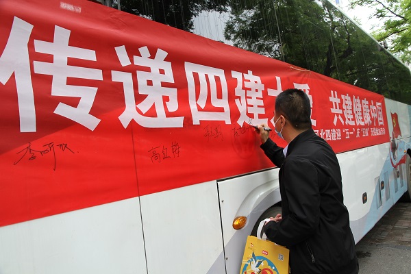 “您感覺怎么樣啊?”“感覺良好!和平時(shí)沒什么不一樣。”“回去多喝水,注意休息,不要做劇烈運(yùn)動(dòng)。”“請(qǐng)跟我到這邊簽個(gè)名。”……聶玉朝第一個(gè)從愛心車上走下來(lái),便“遭到”宣傳部工作人員“攔截”。